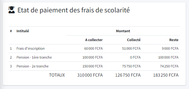 Créez les différents frais de scolarité à votre convenance. Ils sont ensuite automatiquement affecté à chaque dossier d'inscription pour un suivi rapide, simple et efficace.