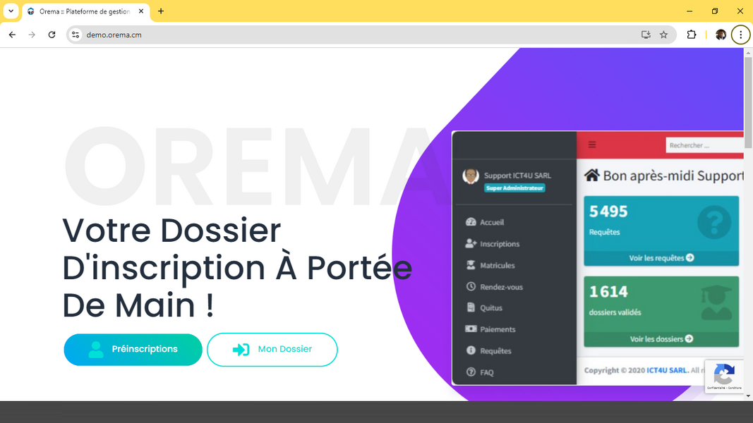 Orema est une solution logicielle web innovante développée par ICu SARL, conçue pour transformer le processus d'admission des étudiants en une expérience fluide et contrôlée. Avec Orema, les établissements d'enseignement supérieur peuvent personnaliser les frais de scolarité selon différents critères, assurant ainsi une gestion financière précise et adaptée à leur structure. De plus, la plateforme intègre une fonctionnalité de communication par SMS, permettant une interaction directe et instantanée avec les étudiants. Orema se distingue par sa simplicité d'utilisation, son interface intuitive et ses mesures de sécurité robustes, rendant la gestion des admissions accessible depuis n'importe quel appareil connecté à Internet. Cette plateforme représente un pas en avant vers la digitalisation des processus éducatifs, en mettant l'accent sur l'accessibilité et l'efficacité.