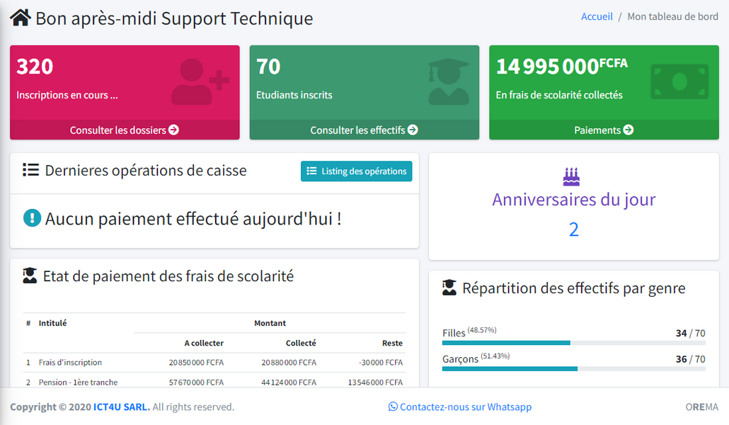 l'évolution des inscriptions, réinscriptions et les paiements